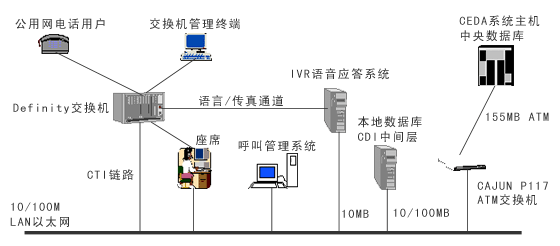 浦東機(jī)場呼叫中心系統(tǒng)建有本地數(shù)據(jù)庫,但有許多信息需與中央數(shù)據(jù)庫交換。所以依托高速的ATM主干網(wǎng)絡(luò),利用基于TCP/IP網(wǎng)絡(luò)協(xié)議的CDI(CEDA Data Interface)通信方式作為中間件,進(jìn)行本地數(shù)據(jù)庫與中央數(shù)據(jù)庫之間的信息交互和共享,完成本系統(tǒng)與機(jī)場信息集成系統(tǒng)的中央數(shù)據(jù)庫連通。