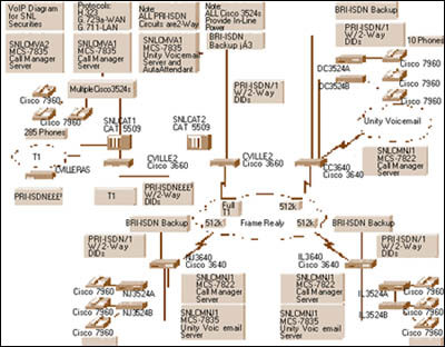 3524交換機,它們能支持330多部思科IP 電話。各城市間的站點通過幀中繼WAN互相連接。在夏洛特斯維爾,3個基本速率接口(PRI)線路提供與公眾交換電話網(wǎng)(PSTN)的連接。由于SNL
