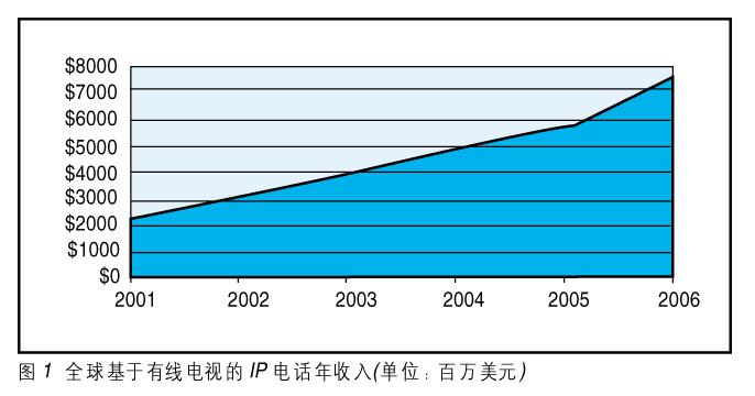 有線電視運營商在尋找使用有線電視基礎(chǔ)網(wǎng)絡HFC的新服務,創(chuàng)造新的經(jīng)濟增長點,提供數(shù)據(jù)、語音、圖像綜合的服務;谟芯電視系統(tǒng)的IP電話將是第一個最有可能推出的新服務。2002年InStat/MDR的分析報告說2006年基于有線電視的IP電話網(wǎng)將達到US$75億的年收入,如圖1所示。