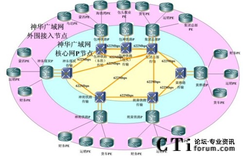 據(jù)神華集團(tuán)信息管理部廣域網(wǎng)項(xiàng)目負(fù)責(zé)人說:“該項(xiàng)目建成后將是一個建設(shè)在高速傳輸網(wǎng)平臺之上,并利用其提供的線路構(gòu)成廣域網(wǎng)核心節(jié)點(diǎn)之間的互聯(lián)線路,網(wǎng)絡(luò)拓?fù)湓?個核心節(jié)點(diǎn)和以北京節(jié)點(diǎn)為中心直連7個核心節(jié)點(diǎn)的放射型622M環(huán)形+放射混合性企業(yè)頂級骨干廣域數(shù)據(jù)網(wǎng)絡(luò)結(jié)構(gòu)。該網(wǎng)絡(luò)結(jié)構(gòu)可避免任一段光纜中斷造成某節(jié)點(diǎn)直連線路和環(huán)線同時中斷的可能性,即對網(wǎng)絡(luò)單點(diǎn)故障實(shí)現(xiàn)環(huán)路保護(hù)。同時,網(wǎng)絡(luò)中斷到恢復(fù)的周期大大縮短:傳輸系統(tǒng)中SDH的環(huán)路自愈從中斷到恢復(fù)周期為50ms,網(wǎng)絡(luò)節(jié)點(diǎn)之間通過IGP的路由收斂,從中斷到恢復(fù)的周期約為200ms。”