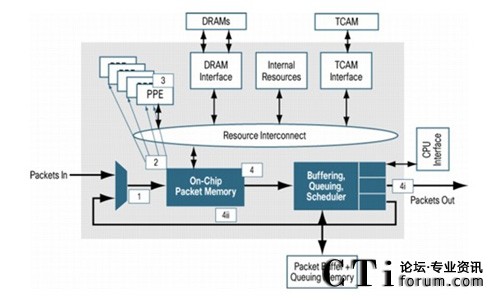 第一代QuantumFlow處理器(QFP)使用90nm工藝, QFP擁有40個(gè)定制QFP數(shù)據(jù)包處理引擎(PPE),每個(gè)PPE支持4個(gè)執(zhí)行線程。利用多達(dá)160個(gè)并行運(yùn)行的獨(dú)立處理器線程,平均每線程功耗僅0.51W, 遠(yuǎn)低于業(yè)界平均水平。同時(shí)QFP提供了一個(gè)高速的多核互聯(lián)總線,確保每個(gè)內(nèi)核都能及時(shí)快速的訪問到相關(guān)的資源,并且能夠避免在不夠先進(jìn)的硬件架構(gòu)中常見的CPU過度使用和超長(zhǎng)延遲問題,而傳統(tǒng)的網(wǎng)絡(luò)處理器架構(gòu)僅有少量的內(nèi)核,因此需要使用交換矩陣或總線將多塊網(wǎng)絡(luò)處理器互聯(lián)才能達(dá)到和QFP相同的處理速度,其功耗遠(yuǎn)高于QFP系統(tǒng),而多塊網(wǎng)絡(luò)處理器資源互相訪問將會(huì)帶來大量的數(shù)據(jù)包延遲。