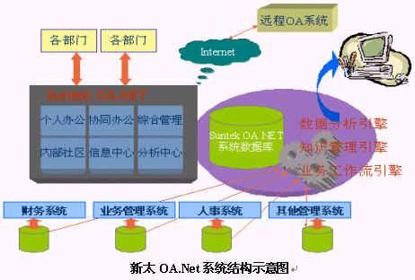 新太OA.NET系統(tǒng)采用B/S結(jié)構(gòu)設(shè)計,系統(tǒng)以提供大量快速靈活的自定義功能以及許多核心平臺產(chǎn)品,如協(xié)同工作平臺、通訊平臺、知識管理平臺、信息服務(wù)平臺等,能夠幫助用戶快速實施信息化建設(shè),OA.NET系統(tǒng)的最大特色是實現(xiàn)"零代碼"維護(hù)功能,系統(tǒng)安裝后,無需編寫任何代碼就可生成各種辦公業(yè)務(wù)應(yīng)用,用戶只需幾個小時的培訓(xùn)就可以使用OA.Net提供的工具進(jìn)行復(fù)雜辦公流程的設(shè)計,并且可以不需要經(jīng)過任何編碼的改動,就能輕松適應(yīng)流程變化的新情況。另外,OA.NET強(qiáng)調(diào)對企業(yè)內(nèi)部知識的有效管理和有效利用,能夠沉積企業(yè)日常的零散信息,并通過有序歸類的方式使之成為對企業(yè)有用的知識。OA.Net還提供了功能強(qiáng)大的個性化配置功能,每個員工都可以定制自己的界面風(fēng)格和功能模塊,并且可以自己建立個人的應(yīng)用環(huán)境,滿足個人的喜好。OA.Net包含了新太自主開發(fā)的業(yè)務(wù)工作流處理引擎,能夠在不用編寫代碼的情況集成其他業(yè)務(wù)系統(tǒng),實現(xiàn)了業(yè)務(wù)系統(tǒng)中的數(shù)據(jù)和辦公流程的完美結(jié)合,使得辦公應(yīng)用系統(tǒng)真正成為企業(yè)內(nèi)部的廣義化辦公門戶。
