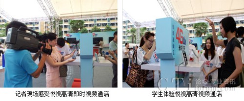 這次在廣州大學城開展的發(fā)布會,吸引了很多在校大學生的參加,下圖是記者和學生現(xiàn)場體驗通過悅視高清視頻通話玩即時猜拳游戲,傳輸?shù)乃挟嬅娣浅G逦鲿,悅視產品的優(yōu)質體驗讓人享受無線高質量流媒體服務的同時深刻感受到TD-LTE高帶寬、低時延的優(yōu)勢。
