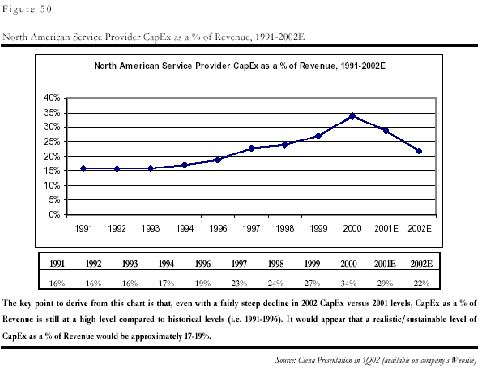 和中國的問題一樣,制造商的問題是電信服務(wù)企業(yè),即運營商的投入減少造成的。由于上世紀(jì)末互聯(lián)網(wǎng)和電子商務(wù)泡沫的虛假繁榮的影響,各運營商都嚴(yán)重高估了市場需求,認(rèn)為需求是會隨著通信能力的增強無限增加,因此市場規(guī)模是會無限擴張的,他們在缺乏對最終用戶需求的深入分析的前提下,普遍在基礎(chǔ)設(shè)施的建設(shè)上進(jìn)行了超大規(guī)模的投入,其基礎(chǔ)設(shè)施建設(shè)投入在收入中的比例一度在2000年從平均的15%達(dá)到了創(chuàng)記錄的35%!