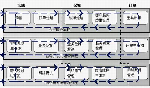 由于是從技術(shù)的角度出發(fā),國(guó)內(nèi)在介紹OSS的時(shí)候,是以實(shí)施、保障和計(jì)費(fèi)縱向的角度介紹的,而當(dāng)我們認(rèn)真地考察TOM圖時(shí)會(huì)發(fā)現(xiàn),OSS最大的意義是橫向的,即從橫向看的TOM圖的每一層,正好構(gòu)成一個(gè)完整的業(yè)務(wù)循環(huán),從上到下依次為:客戶服務(wù)流程、運(yùn)營(yíng)流程和系統(tǒng)管理流程。電信企業(yè)只有按照TOM圖來(lái)規(guī)劃自己的業(yè)務(wù)部門劃分和相互銜接,才能最大限度地利用OSS所能提供的支持。而現(xiàn)有運(yùn)營(yíng)商的部門設(shè)置都仍是縱向劃分的,要轉(zhuǎn)成按流程橫向劃分,必須要對(duì)電信運(yùn)營(yíng)管理有深入了解。國(guó)內(nèi)介紹OSS的企業(yè)大都是系統(tǒng)集成商,不懂電信運(yùn)營(yíng),同時(shí)為了自己銷售的需要,都是從技術(shù)的角度縱向介紹,更進(jìn)一步加大了運(yùn)營(yíng)商利用OSS體系實(shí)現(xiàn)管理轉(zhuǎn)型的難度!