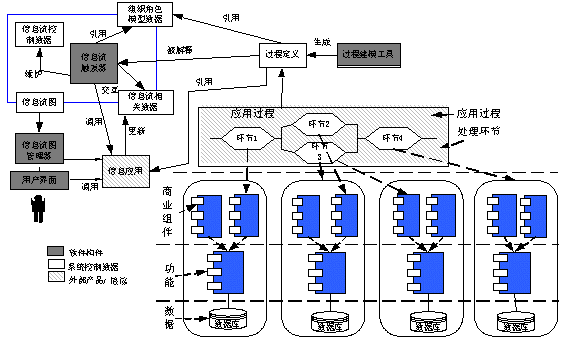 一體化信息平臺(tái)的總體結(jié)構(gòu)大體上分為數(shù)據(jù)層、功能、商業(yè)組件、處理環(huán)節(jié)、應(yīng)用過(guò)程層,功能層提供基本的基礎(chǔ)功能和商業(yè)功能元件,商業(yè)組件封裝了相關(guān)的數(shù)據(jù)和功能元件,可以被客戶關(guān)系管理系統(tǒng)各環(huán)節(jié)調(diào)用,通過(guò)以客戶為中心的信息流管理控制順序執(zhí)行處理環(huán)節(jié),實(shí)現(xiàn)商業(yè)過(guò)程。