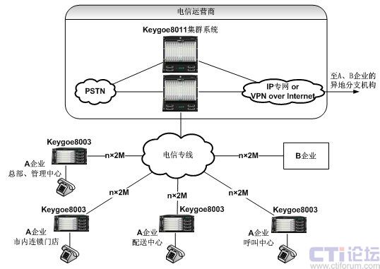 電信運(yùn)營商在核心機(jī)房部署由東進(jìn)Keygoe系列多媒體交換機(jī)組成的高性能集群交換機(jī)系統(tǒng),各個(gè)企業(yè)以及各企業(yè)的市內(nèi)分支機(jī)構(gòu)(如管理中心、連鎖門店、配送中心、呼叫中心等)分別配置東進(jìn)Keygoe系列多媒體交換機(jī),并通過電信運(yùn)營企業(yè)的2M專線(E1中繼)方式上聯(lián)到電信運(yùn)營商核心機(jī)房的交換機(jī)集群系統(tǒng),組成一個(gè)以集群交換機(jī)系統(tǒng)為核心的星形網(wǎng)絡(luò)(如上圖所示)。所有的市話呼入和呼出都通過核心節(jié)點(diǎn)和電信運(yùn)營商的中繼通道,為連鎖型商業(yè)企業(yè)提供內(nèi)部話音通訊的統(tǒng)一編號(hào)、統(tǒng)一撥號(hào)、統(tǒng)一維護(hù)和管理,企業(yè)對(duì)外公布統(tǒng)一和便于記憶的號(hào)碼,實(shí)現(xiàn)企業(yè)管理、營銷和客戶服務(wù)的統(tǒng)一化和規(guī)范化。核心機(jī)房的高性能集群交換機(jī)系統(tǒng)充分考慮冗余備份,如模塊和整機(jī)設(shè)備的雙冗余,從而提高整個(gè)通信平臺(tái)的高可用性和高可靠性。各個(gè)分支的多媒體交換機(jī)具備本地的獨(dú)立工作能力,即使在中繼線路出現(xiàn)故障的情況下,也能正常的工作。同時(shí),Keygoe系列多媒體交換機(jī)集成了7號(hào)信令、會(huì)議、傳真、語音等豐富的多媒體處理資源,可以為用戶開發(fā)靈活多樣的智能業(yè)務(wù)和增值業(yè)務(wù),豐富了系統(tǒng)的應(yīng)用。