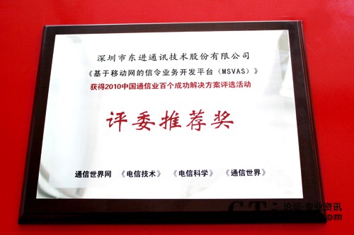 從2010年7月起評選進(jìn)入征集階段,經(jīng)過長達(dá)3個(gè)月的層層篩選,最終百個(gè)成功解決方案出爐,并由多家主流媒體公示。東進(jìn)技術(shù)“基于移動(dòng)網(wǎng)的信令業(yè)務(wù)開發(fā)平臺(tái)(MSVAS)”解決方案憑借出眾的實(shí)用經(jīng)濟(jì)性、安全可靠性、靈活性和成熟性,經(jīng)過兩個(gè)月網(wǎng)絡(luò)初選,和近百位運(yùn)營商層面專業(yè)人士組成的組委會(huì)技術(shù)終選后獲此殊榮。