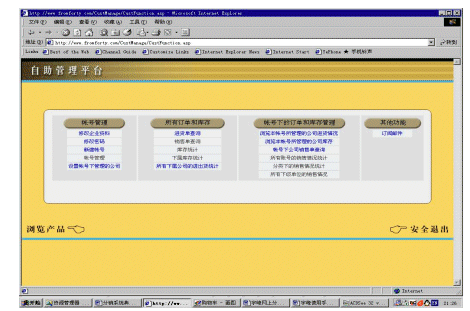 ebanswers分銷系統(tǒng)的一個(gè)重要特色就是自助管理平臺(tái),用戶可以在這個(gè)平臺(tái)中完成絕大部分管理、查詢和統(tǒng)計(jì)的工作。自助管理平臺(tái)主要有四大部分組成:帳號(hào)管理、公司下訂單和庫存管理、帳號(hào)下訂單和庫存管理、其他功能。其中帳號(hào)管理主要是管理與公司和帳號(hào)有關(guān)的各類信息,公司下訂單和庫存管理、帳號(hào)下訂單和庫存管理這兩個(gè)部分主要是用來查詢和統(tǒng)計(jì)各項(xiàng)信息的。