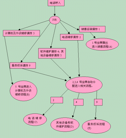 在交互式語音應(yīng)答系統(tǒng)IVR的幫助下,各服務(wù)流程有條不紊地進(jìn)行,每個(gè)職能部門管理自己部門的流程,提供全方位的客戶所要求的服務(wù)。下面我們以銷售咨詢?yōu)槔,看看這個(gè)簡(jiǎn)單的工作流程。