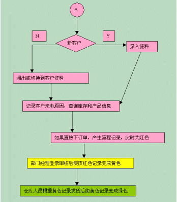 可以根據(jù)訂單上的不同顏色來判斷流程走到的階段。流程開始時(shí)候,訂單的列表中會(huì)產(chǎn)生一條紅色記錄,部門經(jīng)理登錄審核后使該紅色記錄變成黃色,倉庫人員根據(jù)黃色記錄發(fā)貨后使黃色記錄變成綠色。