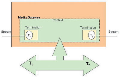 H.248工作在主從模式,并定義了連接模型(參見圖2)。連接模型中有終端、流以及上下文。終端是出/入分組網(wǎng)絡(luò)的媒體流的連接,它允許信號(hào)應(yīng)用到媒體流上,如發(fā)送忙音; 也允許從媒體流中接受發(fā)生的事件,如收到DTMF信號(hào)。上下文則是將終端上媒體流混合并橋接在一起,并描述媒體流之間的關(guān)系。