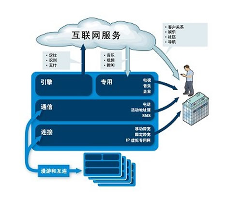根據(jù)服務(wù)種類(lèi)的不同,運(yùn)營(yíng)商正在扮演的角色可以分成4種(見(jiàn)上圖):一是連接性,提供最基本的帶寬;二是通信性,提供語(yǔ)音、短信、彩信等通信服務(wù);三是專(zhuān)用服務(wù),通常是指一些運(yùn)營(yíng)商給自有用戶(hù)提供的專(zhuān)用的融合服務(wù),比如前面提到的AT&T的IPTV服務(wù);四是電信能力引擎,即之前提到的電信能力開(kāi)放。