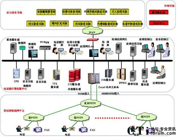 中國郵政儲蓄銀行電話銀行暨信用卡客服中心系統(tǒng)的物理結(jié)構(gòu)如下圖所示: