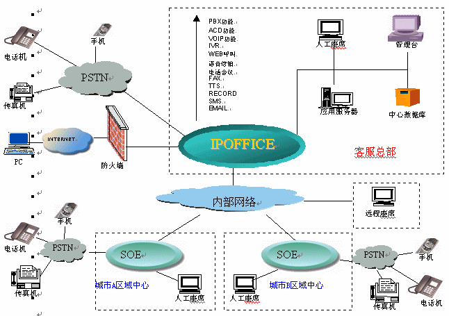利用IP PBX(如AVAYA IP OFFICE)強大的組網(wǎng)能力,EasyIVR平臺提供集中接入的統(tǒng)一控制平臺,只需在總部建立呼叫中心系統(tǒng)即可實現(xiàn)對全網(wǎng)分布式呼叫中心坐席的統(tǒng)一控制,包括統(tǒng)一話務分配、統(tǒng)一報表、統(tǒng)一監(jiān)控等等應用,節(jié)省了大量的呼叫系統(tǒng)硬件投入、軟件采購、維護及運營費用。