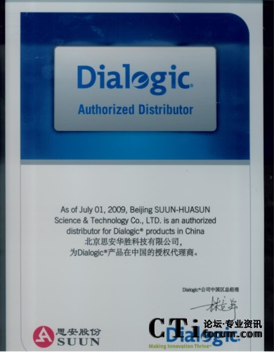 2009年7月1日DIALOGIC公司為其大陸地區(qū)DIALOGIC產(chǎn)品總代理-------北京思安華勝科技有限公司頒發(fā)了09版的代理證書,新的代理證書不僅在版面和內(nèi)容上與以往有所不同,更重要的是說明了代理的產(chǎn)品范圍(由于新近收購的NMS、Cantata等產(chǎn)品,國內(nèi)原來就有代理商,現(xiàn)在所有產(chǎn)品都在Dialogic旗下,為了避免發(fā)生混淆和誤會,本次的代理證書增加了附頁,附頁里面規(guī)定了代理商所代理的產(chǎn)品的范圍,我們歡迎朋友們以各種形式來我公司或Dialogic公司北京代表處咨詢和驗證)。此舉強調(diào)了渠道的正規(guī)性和權(quán)威性,北京思安華勝公司目前是DIALOGIC公司原DIALOGIC系列產(chǎn)品在中國的唯一總代理,承擔著Dialogic系列產(chǎn)品的銷售、市場推廣、技術(shù)支持、售后服務(wù)、保修服務(wù)等一系列重要工作。