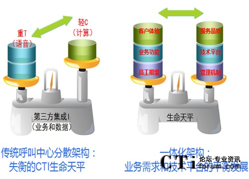 因此很長(zhǎng)一段時(shí)間以來(lái)呼叫中心都作為語(yǔ)音通訊的分支之一而存在,而這種定位給呼叫中心的生命力帶來(lái)了不平衡的發(fā)展,根源就在于“輕C重T第三方集成I”的格局:語(yǔ)音處理性能和功能強(qiáng)大,計(jì)算能力和數(shù)據(jù)處理弱,因此將業(yè)務(wù)集成和數(shù)據(jù)集成交由第三方承擔(dān)。因此很長(zhǎng)一段時(shí)間,造成呼叫中心在企業(yè)購(gòu)買(mǎi)之后對(duì)業(yè)務(wù)應(yīng)用的適應(yīng)能力差、業(yè)務(wù)發(fā)展和變化時(shí)系統(tǒng)穩(wěn)定性變的無(wú)法保證。