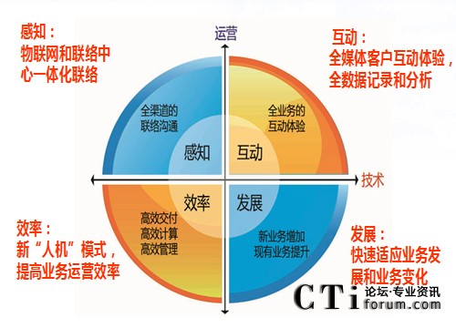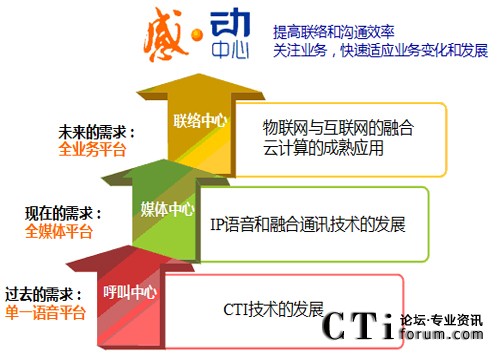 這是“感•動(dòng)中心”的主旨,完全以客戶(hù)的業(yè)務(wù)為出發(fā)點(diǎn),體現(xiàn)“以客戶(hù)為中心”的理念。而“全景中心”、“聯(lián)絡(luò)中心”等以純技術(shù)為中心,還停留在多媒體通訊和UC通訊手段融合層面,只是新增加了一些新方式的接入等技術(shù),對(duì)于客戶(hù)業(yè)務(wù)的融合和適應(yīng),并沒(méi)有任何提升。