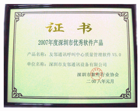 2008年3月14日,深圳市友鄰通訊設備有限公司(以下簡稱“友鄰通訊”)宣布,公司主打軟件產(chǎn)品“友鄰通訊呼叫中心質(zhì)量管理軟件V5.0”(即 AP Suite 呼叫中心質(zhì)量管理系統(tǒng)V5.0)榮獲深圳市軟件行業(yè)協(xié)會“2007年度深圳市優(yōu)秀軟件產(chǎn)品”榮譽稱號。