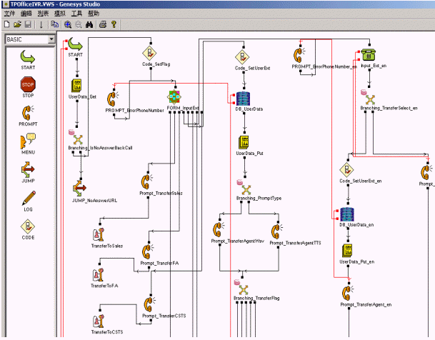 GVP提供了界面友好的功能強(qiáng)大的語(yǔ)音應(yīng)用開(kāi)發(fā)工具-Genesys Studio,其中預(yù)定了豐富的控件,用來(lái)實(shí)現(xiàn)菜單語(yǔ)音播報(bào)、DTMF收集以及對(duì)數(shù)據(jù)庫(kù)查詢等諸多功能。通過(guò)拖放的方式就可以快速的隨心所欲地設(shè)計(jì)出你所需要的語(yǔ)音邏輯應(yīng)用流程,最終編譯產(chǎn)生用于發(fā)布的ASP或者JSP頁(yè)面。應(yīng)用之間可以彼此調(diào)用,提高了語(yǔ)音應(yīng)用的靈活性和可重用性。Genesys Studio還提供了靈活實(shí)用的調(diào)試工具,可以隨意設(shè)置斷點(diǎn)實(shí)時(shí)跟蹤流程的執(zhí)行情況,極大的方便了語(yǔ)音應(yīng)用流程的調(diào)試。