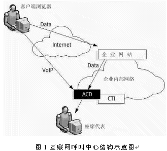 互聯(lián)網(wǎng)呼叫中心是在互聯(lián)網(wǎng)技術(shù)飛速發(fā)展的基礎(chǔ)上所產(chǎn)生的。對(duì)于客戶而言,完全的互聯(lián)網(wǎng)呼叫中心和傳統(tǒng)呼叫中心最大的區(qū)別就在于客戶無需電話,只要從一個(gè)Web站點(diǎn)就可以直接進(jìn)入互聯(lián)網(wǎng)呼叫中心。這樣一來,呼叫中心就從傳統(tǒng)形式上的“撥號(hào)-交談(Dial to Talk)”發(fā)展到現(xiàn)代形式的“點(diǎn)擊-交談(Click to Talk)”。典型的互聯(lián)網(wǎng)呼叫中心結(jié)構(gòu)如圖1所示。