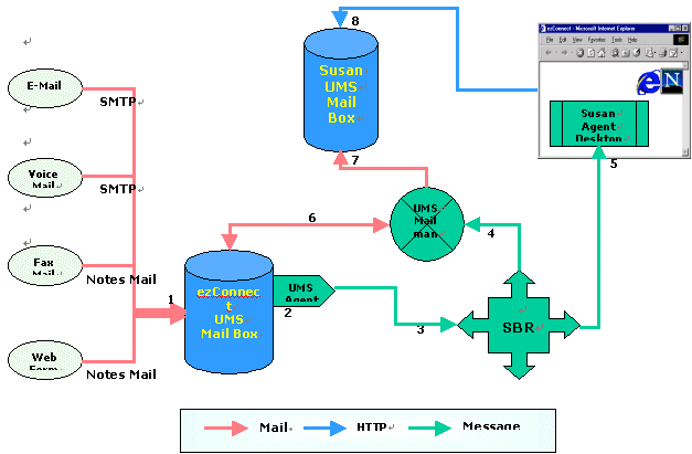各類外部語(yǔ)音、郵件、WEB、傳真等信息進(jìn)入呼叫中心會(huì)以相應(yīng)的格式直接被放入ezConnect統(tǒng)一郵件服務(wù)器(1),消息經(jīng)過(guò)UMS Agent 模塊被提取出信息主題和關(guān)鍵字(2),這些主題和關(guān)鍵字被送入基于技能的路由選擇模塊SBR(3),由SBR進(jìn)行分析,選擇出最合適服務(wù)的座席(例如是Susan);之后SBR通知郵件轉(zhuǎn)發(fā)器(4)去ezConnect統(tǒng)一郵件服務(wù)器中取相應(yīng)的郵件(6),將郵件放入最佳座席(Susan)的UMS信箱中(7)(8),與此同時(shí)座席Susan的界面上顯示出她有一封新的郵件(5)。至此,完成了座席Susan 接收UMS信件的全過(guò)程。