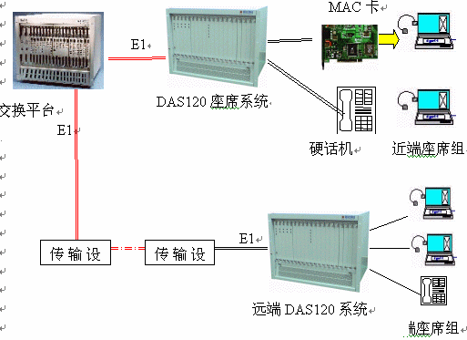 DAS120交換平臺采用1-4個E1連接,可以簡潔實現(xiàn)PCM信號轉模擬信號引出到座席。E1接口的信令可選配為隨路信令CAS和透明通道Clear Channel。E1可通過光端機、微波、HDSL等設備來傳輸,從而實現(xiàn)分布式組網。
