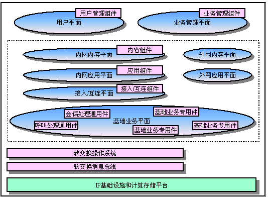 從結(jié)構(gòu)上看,業(yè)務(wù)驅(qū)動(dòng)的軟交換平臺(tái)是一個(gè)復(fù)雜的多域多層組件平臺(tái)。一個(gè)電信業(yè)務(wù)的實(shí)現(xiàn)是對(duì)平臺(tái)上的組件的組裝過(guò)程。業(yè)務(wù)驅(qū)動(dòng)的軟交換平臺(tái)上的組件分為用戶平面、基礎(chǔ)業(yè)務(wù)平面、接入/互連/移動(dòng)控制平面、應(yīng)用平面、內(nèi)容平面和業(yè)務(wù)管理平面。用戶平面的組件負(fù)責(zé)維護(hù)用戶的注冊(cè)信息、位置信息、狀態(tài)信息、業(yè)務(wù)信息和業(yè)務(wù)使用信息;A(chǔ)業(yè)務(wù)平面的組件分為三大類(lèi)型:電路基礎(chǔ)業(yè)務(wù)、包交換基礎(chǔ)業(yè)務(wù)和多媒體交換基礎(chǔ)業(yè)務(wù)。每個(gè)基礎(chǔ)業(yè)務(wù)分成傳輸層、承載層、媒體層、呼叫處理層和業(yè)務(wù)層,其中的控制包括了對(duì)各層功能的控制協(xié)議和層間交互的控制協(xié)議。接入/互連/移動(dòng)控制平面中包含了對(duì)各種接入網(wǎng)絡(luò)的控制、對(duì)互聯(lián)網(wǎng)絡(luò)的控制和對(duì)移動(dòng)性的控制協(xié)議,也分成傳輸層、承載層、媒體層、呼叫處理層和業(yè)務(wù)層的控制組件。應(yīng)用平面的組件分為三種類(lèi)型,基于傳統(tǒng)智能網(wǎng)(IN,