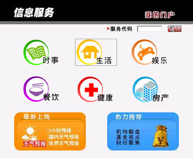 在上海IPTV提供的業(yè)務(wù)中,信息服務(wù)也是眾多用戶喜聞樂見的一項(xiàng)業(yè)務(wù),內(nèi)容覆蓋廣泛。它提供了時(shí)事、生活、娛樂、餐飲、健康、房產(chǎn)等信息,其中“時(shí)事”一欄呈現(xiàn)了新浪上海熱線實(shí)時(shí)傳遞的全球最新新聞資訊,讓老百姓“手握遙控器,便知天下事”,“健康”一欄更是一網(wǎng)打盡上海地區(qū)醫(yī)療機(jī)構(gòu)的信息資訊,特色?扑阉鳛橛脩籼峁┍憬莸尼t(yī)療信息服務(wù),“房產(chǎn)”中上海地區(qū)各類二手房產(chǎn)訊息一應(yīng)俱全,價(jià)格、地段、房型等應(yīng)有盡有。