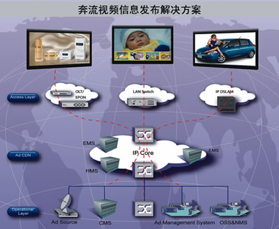 UT斯達(dá)康緊跟市場發(fā)展趨勢和運(yùn)營商步伐,深入研究戶外液晶廣告業(yè)務(wù)的發(fā)展、大力推進(jìn)廣告平臺(tái)的研發(fā)。2006年,UT斯達(dá)康推出了奔流(RollingStream)視頻信息發(fā)布解決方案(如圖2所示)。奔流視頻信息發(fā)布解決方案是以奔流(RollingStream)IPTV平臺(tái)為基礎(chǔ),結(jié)合戶外液晶廣告市場需求,融合運(yùn)營商以視頻為主的綜合信息發(fā)布的需求,真正運(yùn)營級(jí)的電信級(jí)解決方案。該方案可以幫助運(yùn)營商實(shí)現(xiàn)融合信息服務(wù)和廣告業(yè)務(wù)的統(tǒng)一運(yùn)營,幫助運(yùn)營商開展兼具公益性和盈利性的信息發(fā)布業(yè)務(wù),運(yùn)營商在推進(jìn)社會(huì)信息化、造福公眾的同時(shí),通過視頻廣告的運(yùn)營,也能獲取盈利。該方案基于電信級(jí)平臺(tái)的穩(wěn)定性、安全性、擴(kuò)展性設(shè)計(jì)要求,可支持百萬級(jí)大規(guī)模部署能力,可提供電信級(jí)質(zhì)量保證的服務(wù);該方案基于IP流媒體技術(shù),可通過IP網(wǎng)絡(luò)實(shí)時(shí)、精準(zhǔn)、互動(dòng)地投放廣告內(nèi)容,從而可以支持豐富、新穎的廣告運(yùn)營模式;該方案基于數(shù)字多媒體技術(shù),除了可以發(fā)布視頻廣告,還可以發(fā)布圖片、文字、消息等廣告內(nèi)容。