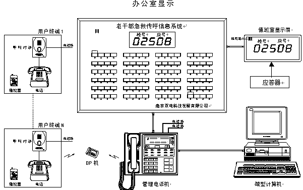 辦公室顯示大屏、管理電話機、值班室顯示屏、應(yīng)答器、系統(tǒng)管理軟件(安裝在微型計算機)