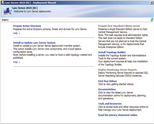 準(zhǔn)備好基礎(chǔ)結(jié)構(gòu)并發(fā)布拓?fù)浜,即可開始安裝前端服務(wù)器和服務(wù)器角色,以啟用 A/V 會議、企業(yè)語音、監(jiān)控、存檔及其他功能。準(zhǔn)備每臺服務(wù)器從運(yùn)行部署向?qū)В▍⒁妶D 3)開始,但每個服務(wù)器角色都有自己的安裝和配置要求。您可以在 TechNet 庫的“部署 Lync Server 2010 Standard Edition”部分查找更多詳細(xì)信息。