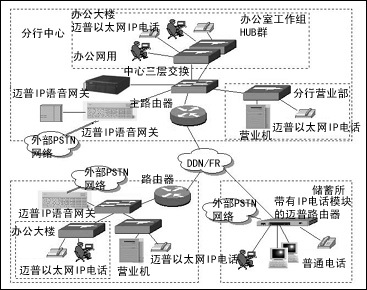 分行中心與下面的支行以及各儲蓄網(wǎng)點根據(jù)業(yè)務應用需求出發(fā),可以利用邁普各系列路由器產(chǎn)品,通過DDN或者幀中繼把分行辦公大樓和營業(yè)部、支行辦公大樓和營業(yè)部、分行和支行下屬儲蓄所連起來。對于分行中心以及下面的支行,由于網(wǎng)絡結(jié)構(gòu)比較復雜,再加上網(wǎng)絡基礎設施建設已經(jīng)很完善,一般可以采用邁普IP語音網(wǎng)關,通過它與原有的外部PSTN網(wǎng)絡相連。而對于一些較小的儲蓄網(wǎng)點,則可以通過采用帶有IP電話模塊的邁普路由器。邁普路由器的IP電話模塊可與電話機或交換機相連,能夠支持G.711、G.723、G.729等多種語音壓縮算法,并且還支持H.323協(xié)議,實現(xiàn)IP電話功能。