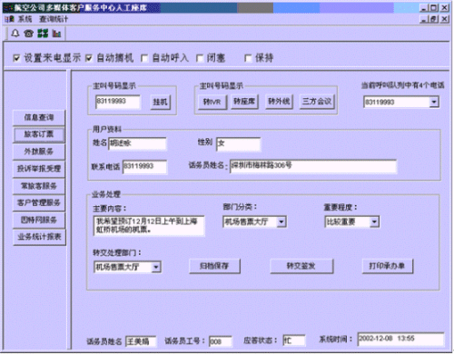 。。客戶打入電話后,當(dāng)系統(tǒng)的自動(dòng)語音應(yīng)答子系統(tǒng)無法解決客戶問題時(shí),客戶可選擇人工服務(wù),由航空公司客戶服務(wù)代表直接接聽客戶電話,處理并解決客戶問題。此時(shí)客戶同座席話務(wù)人員直接溝通,并同時(shí)記錄下該客戶的聯(lián)系方式,將相關(guān)數(shù)據(jù)添加入系統(tǒng)數(shù)據(jù)庫(kù);也可以在數(shù)據(jù)庫(kù)的支持下回答機(jī)場(chǎng)航班/航空貨運(yùn)信息及相關(guān)規(guī)定等的咨詢和疑問、訂座/訂艙?蛻粢部梢赃x擇自動(dòng)語音服務(wù)方式,根據(jù)系統(tǒng)的語音提示輸入按鍵,選擇類別,將自己的投訴和建議以及自己的聯(lián)系方式信息以留言錄音的方式保存在系統(tǒng)中。系統(tǒng)同時(shí)還支持自動(dòng)傳真方式,客戶可以通過傳真機(jī)進(jìn)入本系統(tǒng),通過按鍵選擇傳真方式,將自己的意見建議等的文本內(nèi)容傳真給系統(tǒng),系統(tǒng)自動(dòng)接受并存入數(shù)據(jù)庫(kù)。