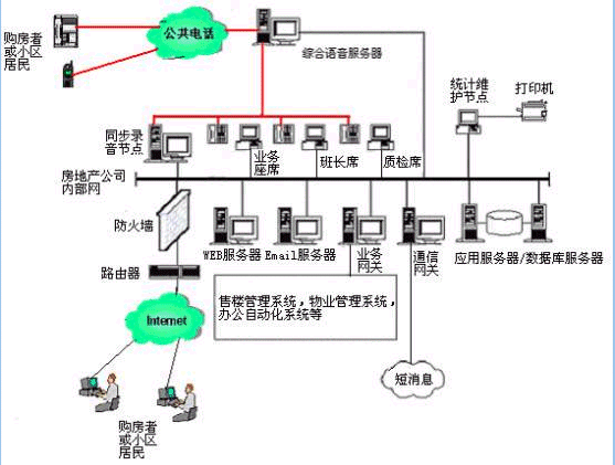 。。用戶利用電話、傳真、WEB、手機(jī)短信息、電子郵件等撥打某一特服號(hào)碼(如95xxx)進(jìn)入房地產(chǎn)多媒體客戶服務(wù)中心系統(tǒng),本系統(tǒng)依托房地產(chǎn)企業(yè)各類業(yè)務(wù)技術(shù)支持系統(tǒng),通過人工受理或自動(dòng)語音服務(wù)等方式為各類客戶提供購房和物業(yè)管理服務(wù);形成了對外服務(wù)于客戶,對內(nèi)管理、分析、決策系統(tǒng)相結(jié)合的呼叫中心。