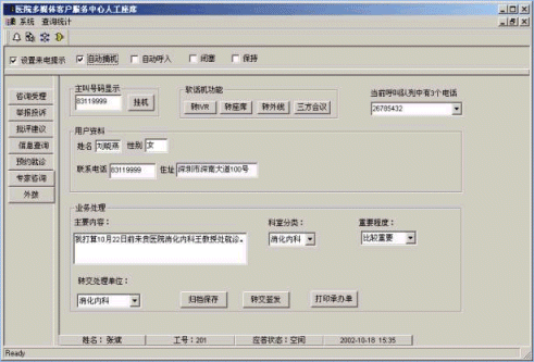 。。為了順應(yīng)時代的潮流,滿足廣大民眾的多樣化看病需求,提高各級醫(yī)院的工作效率、服務(wù)質(zhì)量,醫(yī)院客戶服務(wù)中心應(yīng)運(yùn)而生?梢,客戶服務(wù)中心系統(tǒng)是各醫(yī)院提高服務(wù)質(zhì)量的良好解決方案。客戶服務(wù)中心已經(jīng)成為公認(rèn)的改善服務(wù)的措施,對于醫(yī)院也不例外。通過客戶服務(wù)中心的建設(shè),醫(yī)院不僅可以更大程度地提高服務(wù)質(zhì)量及工作效率,更可以體現(xiàn)出醫(yī)院的高科技特色、吸引眾多患者,同時也可以利用客戶服務(wù)中心多種多樣的增值業(yè)務(wù)來提高醫(yī)院的利潤、達(dá)到盈利性的目的。