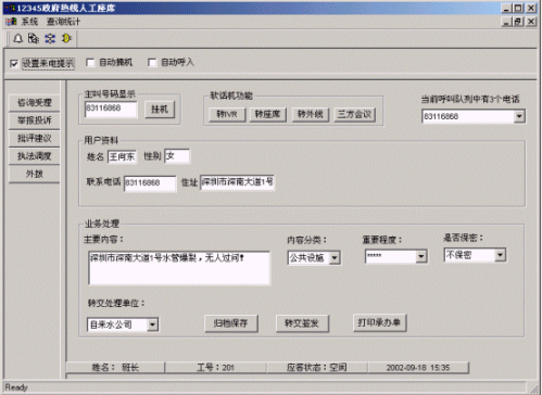 系統(tǒng)提供強(qiáng)大的信息資料處理功能,座席可記錄舉報(bào)、投訴、批評(píng)、建議等記錄單,將信息資料歸檔保存、打印受理單或?qū)⑹芾韱蔚任募D(zhuǎn)交簽發(fā)相關(guān)政府職能部門;系統(tǒng)引入CRM(Customer
