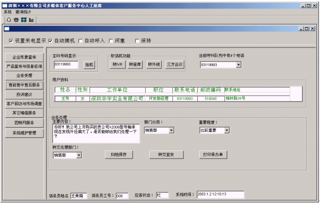 人工座席子系統(tǒng)是人工信息查詢與業(yè)務(wù)受理子系統(tǒng),由業(yè)務(wù)代表、數(shù)字話機(jī)、運(yùn)行Windows系統(tǒng)的PC微機(jī)和耳麥以及相應(yīng)的具體業(yè)務(wù)處理應(yīng)用軟件等組成。電話主要用于與客戶通話,PC機(jī)主要用于記錄客戶基本信息或服務(wù)信息,或是用于檢索客戶所需的業(yè)務(wù)信息。