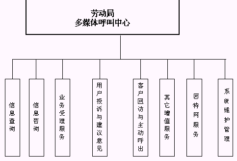 本系統(tǒng)具有自動語音服務(wù)、人工坐席服務(wù)、信息咨詢、信息查詢、客戶投訴建議、客戶回訪與信息調(diào)查、因特網(wǎng)服務(wù)、管理人員對語音記錄的查詢等功能,并且結(jié)合圖形化的管理、監(jiān)控界面,使得客戶隨時隨地可以利用身邊的各種通訊工具獲得勞動局的方便快捷的服務(wù)。