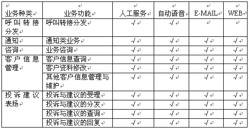 本系統(tǒng)具有自動(dòng)語(yǔ)音服務(wù)、人工坐席服務(wù)、呼叫轉(zhuǎn)接分發(fā)、信息咨詢、信息查詢、客戶投訴建議、通知服務(wù)、因特網(wǎng)服務(wù)、管理人員對(duì)語(yǔ)音記錄的查詢、外包業(yè)務(wù)、增值服務(wù)等功能,并且結(jié)合圖形化的管理、監(jiān)控界面,使得客戶隨時(shí)隨地可以利用身邊的各種通訊工具獲得本公共呼叫中心平臺(tái)的方便快捷的服務(wù)。
