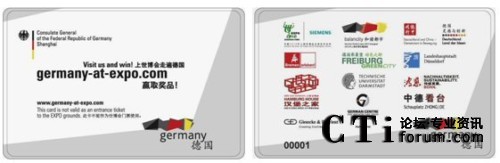 CTI論壇(ctiforum)5月17日消息(記者 潘婷婷):2010年5月,世人矚目的上海世博會已經(jīng)隆重開幕,德國館是其中的大熱門之一。想一睹德國館的風(fēng)采,一般都需要排2~3個小時的長隊。而觀眾可能不知道除了德國國家館外,德國還有多個城市在浦西的城市最佳實踐區(qū)展出。為了讓觀眾更好、更全面地體驗德國參展的所有活動,德國駐上海總領(lǐng)事館聯(lián)手智能卡領(lǐng)域的專家捷德公司共同推出了德國館智能參觀卡,觀眾只需持卡參觀德國的其他相關(guān)展區(qū)后,就可以不用排隊進入德國國家館了。