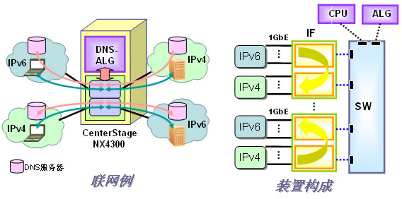 可以在ALG 刀片上搭載將DNS咨詢進(jìn)行IPv6-IPv4轉(zhuǎn)換的ALG功能。與轉(zhuǎn)換服務(wù)器刀片協(xié)作可以實(shí)現(xiàn)IPv6與IPv4的雙方向通信。