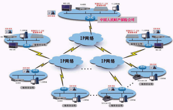 中國人民財產保險股份有限公司,是中國內地最大的非壽險公司,香港證交所上市公司。經過50多年的發(fā)展,中國人保財險公司已經發(fā)展成為網點遍布全國31個省市區(qū),共有營業(yè)機構4000余個的大型商業(yè)公司。為提高辦公效率,降低差旅成本,中國人保財險公司決定建設覆蓋從總公司、省分公司到地市分公司的視頻會議系統(tǒng),項目總容量達600多個節(jié)點,采用兩級級連方式組網,要求系統(tǒng)具備視頻、音頻、數據交互功能,。
