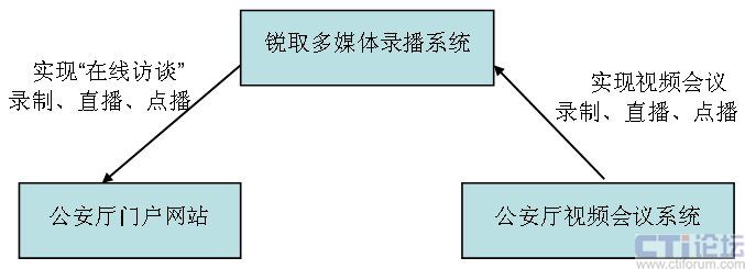 銳取多媒體錄播系統(tǒng)采用了分布式的架構(gòu),前端的視音頻編碼器負(fù)責(zé)視音頻信號的采集,后臺的多媒體錄播服務(wù)器負(fù)責(zé)信號的錄制、直播和點(diǎn)播。前端的視音頻編碼器可從視頻會議系統(tǒng)中獲取信號,這樣“在線訪談”的公安機(jī)關(guān)領(lǐng)導(dǎo)或?qū)<铱梢栽谝曨l會議中的任何一個會場與廣大網(wǎng)民在線交流。
