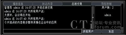 系統(tǒng)增加了多方文字互動交流功能,在線交流功能可以選擇給所有人員發(fā)送消息,也可以選擇給某一特定人員發(fā)送。這樣在會議或培訓的過程中,管理員可以選擇性的提出相應的問題給相關人員,考核相關人員的培訓效果;其他人員也可以將會議或培訓過程中遇到的疑問、難點及時的反應給管理員進行解答,增強會議或培訓的成效。