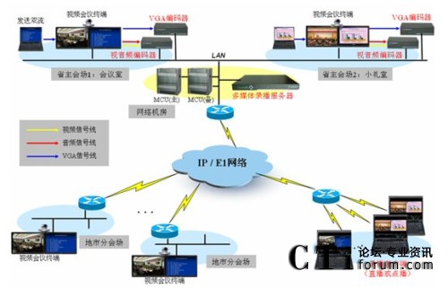 項(xiàng)目中采用了一套銳。ǚ植际剑┒嗝襟w錄播系統(tǒng),其中多媒體錄播服務(wù)器一臺(tái),部署在網(wǎng)絡(luò)機(jī)房;兩套編碼器分別部署在會(huì)議室和小禮堂,編碼器從視頻會(huì)議終端獲取視音頻及雙流信號(hào),并通過IP網(wǎng)絡(luò)發(fā)送給機(jī)房?jī)?nèi)多媒體錄播服務(wù)器,由多媒體錄播服務(wù)器實(shí)現(xiàn)視頻會(huì)議的錄制、直播和點(diǎn)播,該服務(wù)器支持2組會(huì)議并發(fā)錄播,可滿足2組并發(fā)視頻會(huì)議的錄播需要。分會(huì)場(chǎng)及不具備視頻會(huì)議終端的地方,可使用電腦登陸多媒體錄播服務(wù)器來接收會(huì)議的實(shí)時(shí)直播或在會(huì)后進(jìn)行點(diǎn)播。