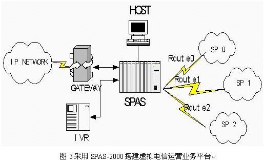 中國加入WTO后,國內與國際的聯系、交流和溝通將會越來越頻繁,這一趨勢帶來了巨大的電信服務市場商機。同時,國際電信企業(yè)正在尋求進入中國的途徑,國內新興的電信運營商積極應對這種局面,而虛擬電信運營商也在國內開始出現。如何爭取客戶是所有這些提供電信服務的企業(yè)共同面臨的課題。一個智能化的、高效的、靈活的、有特點并易于控制的服務平臺無疑是他們進行競爭的重要工具。由于SPAS-2000可編程交換機是一個全開放的靈活平臺,用戶通過應用程序幾乎可以完全控制交換,能很好的滿足用戶的需求。在此SPAS-2000可編程交換機上開發(fā)的電話批發(fā)及零售業(yè)務應用,配合計算機技術,能靈活控制業(yè)務的路由選擇、費率計算并可提供個性化服務,為運營商降低運營成本,提高服務質量給出了有效的解決方案。例如一個IP電話運營商在全球互連中可能有多個合作伙伴,每個合作伙伴提供的服務也不相同,為了節(jié)省費用并提高服務質量,IP電話運營商需要根據時段、費率、通話質量、接通率等指標智能選擇去話路徑。SPAS-2000可編程交換機提供編程開發(fā)接口,通過E1與IVR連接,在服務器上開發(fā)高層應用軟件,可以實現多種高級功能。同時SPAS還可以連接各種型號的網關。應用連接圖見圖3: