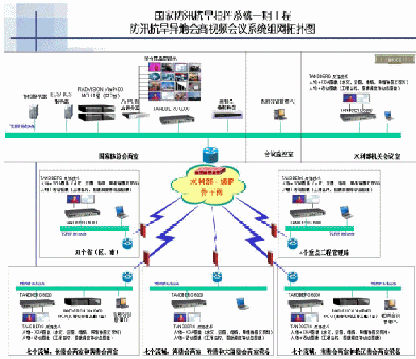 "工欲善其事,必先利其器"。為了推動國家"金水工程"對信息化的要求,2003年,水利部就開始著手籌建國家防汛抗旱指揮視頻會議系統(tǒng)。按照當(dāng)初的項目規(guī)劃,這次視頻會議系統(tǒng)的建設(shè)主要包括水利部、7個流域機構(gòu)、31個。▍^(qū)、市)和4個重點工程局等43個單位的44個節(jié)點。