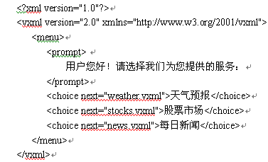 下面是一個VoiceXML簡單例子。當(dāng)用戶與電話語音系統(tǒng)接通以后,將會聽到語音合成的提示"用戶您好!請選擇我們?yōu)槟峁┑姆⻊?wù):" 。當(dāng)用戶說"股票市場"