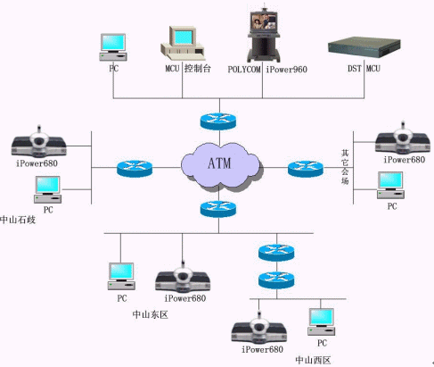 中山公安項目使用一臺DST H.323 MCS 3048/DFG的MCU、25套IPOWER600 SBRI終端和一套IPOWER900終端,目前終端使用4.01.408版本,通過的是IP OVER ATM網絡,到每個會場的帶寬足夠---至少10M,會議召開速率為768Kbps。市局會議中心采用IPOWER900,其它25個分局會場都使用IPOWER600。